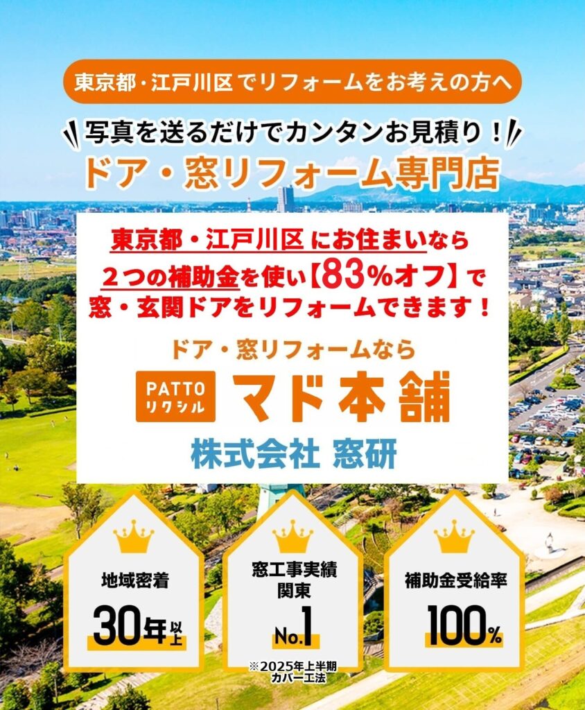 東京都にお住まいなら誰でも使える「クール・ネット東京」補助金と、全国対応の「先進的窓リノベ2026事業」補助金が併用できるため、83%オフで窓・玄関ドアのリフォームを実施頂けます!