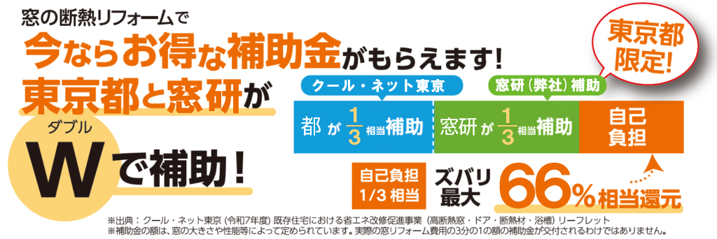東京都にお住まいなら誰でも使える「クール・ネット東京」補助金に加え、「クール・ネット東京」と同等額(工事費用の3分の1)を弊社が「窓研補助金」として補助させて頂き、66%引きで補助金リフォームできる体制を整えました。